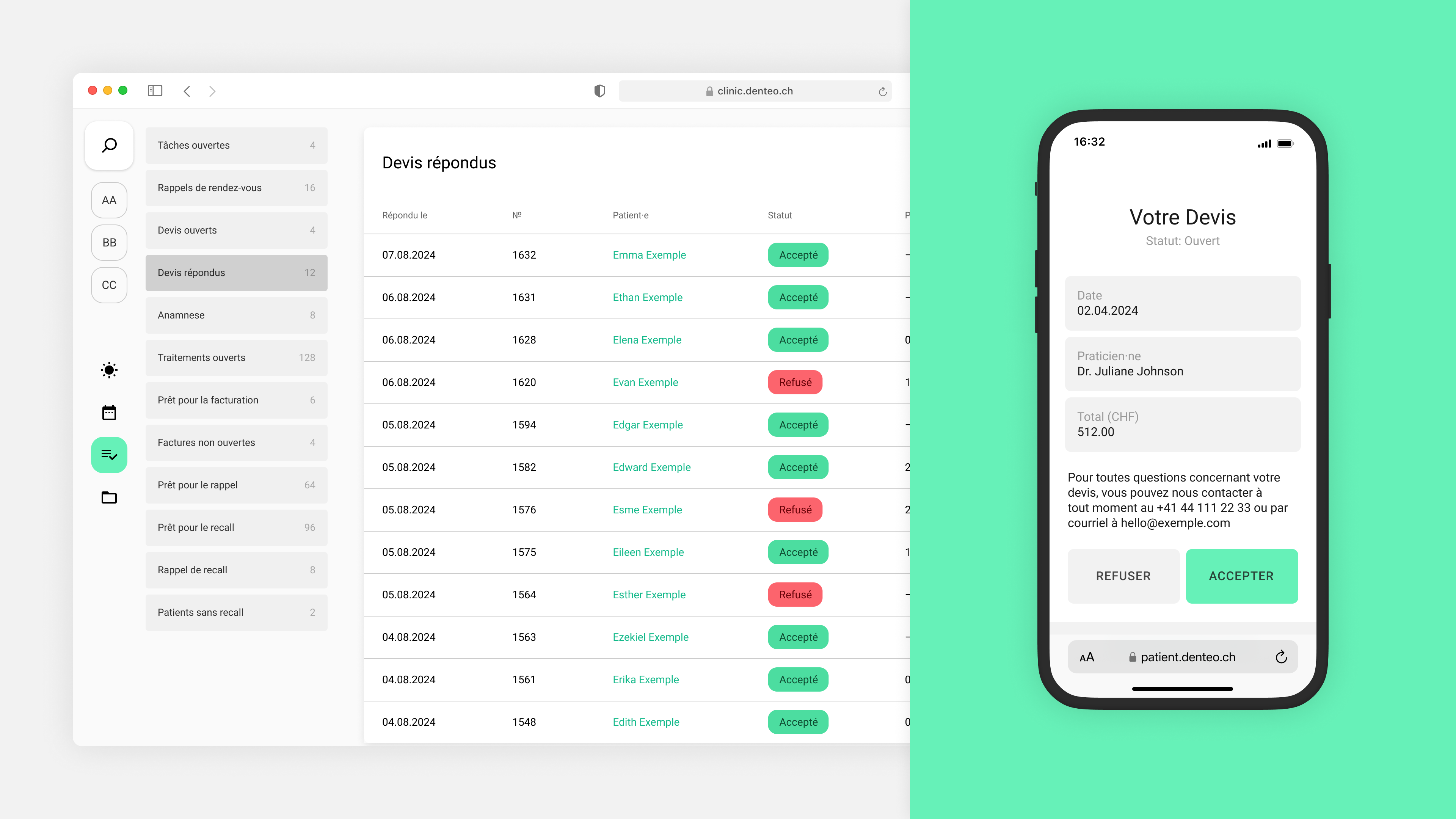 Un devis refusé est vite oublié. Avec Denteo, vous voyez immédiatement lorsqu’une proposition est refusée. Vous pouvez alors recontacter le/la patient·e de manière ciblée ou proposer d’autres options.