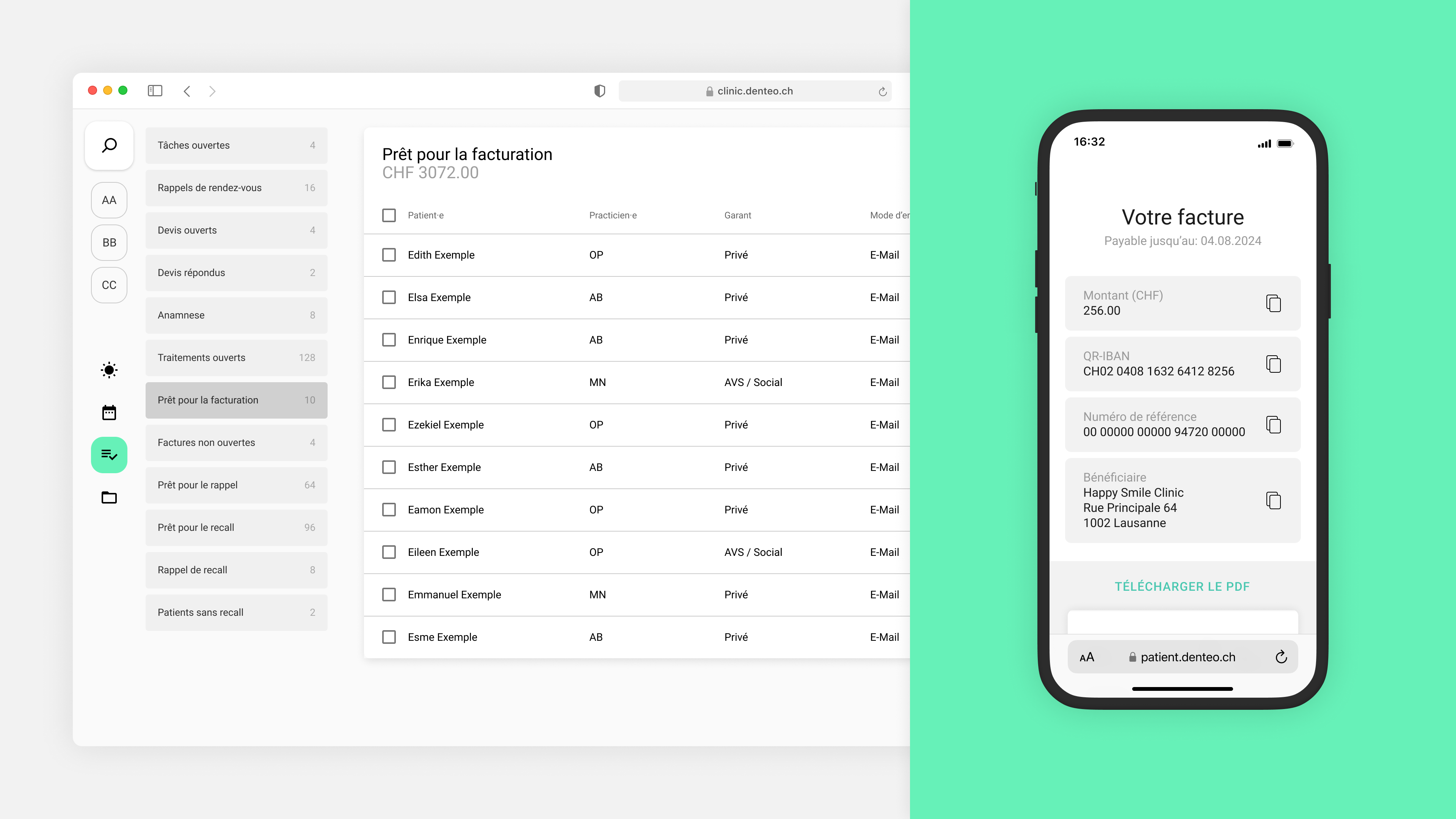 Aujourd’hui, 60 % des patient·e·s suisses préfèrent recevoir leur facture par e-mail. Avec Denteo, vous vous alignez sur leurs habitudes et renforcez leur satisfaction dès la première facture.